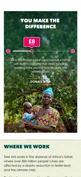 This fantastic project helps sustain the livelihoods of local people living in some of the world's harshest environments. This excellent work is reliant on the generous donations and gifts managed through Tree Aid's website, which was in need of considerable improvements to the design and navigability. As part of the new build, we delivered;