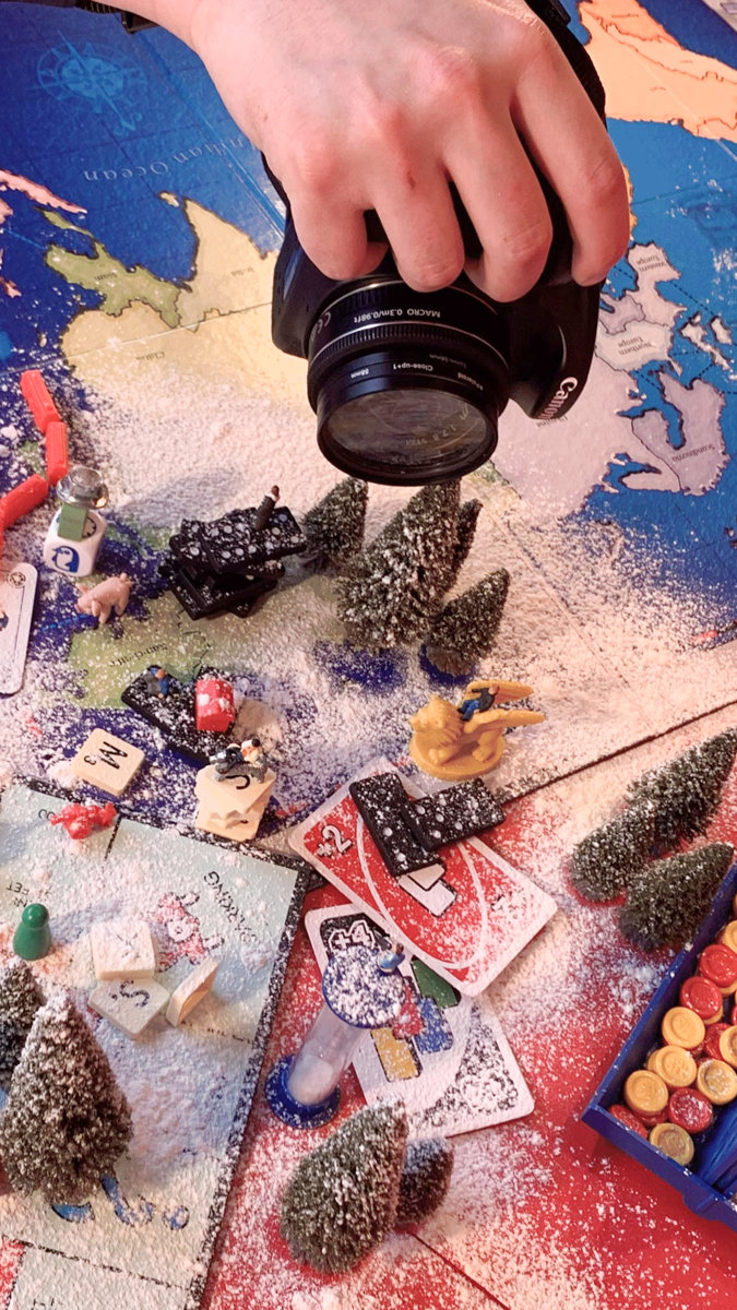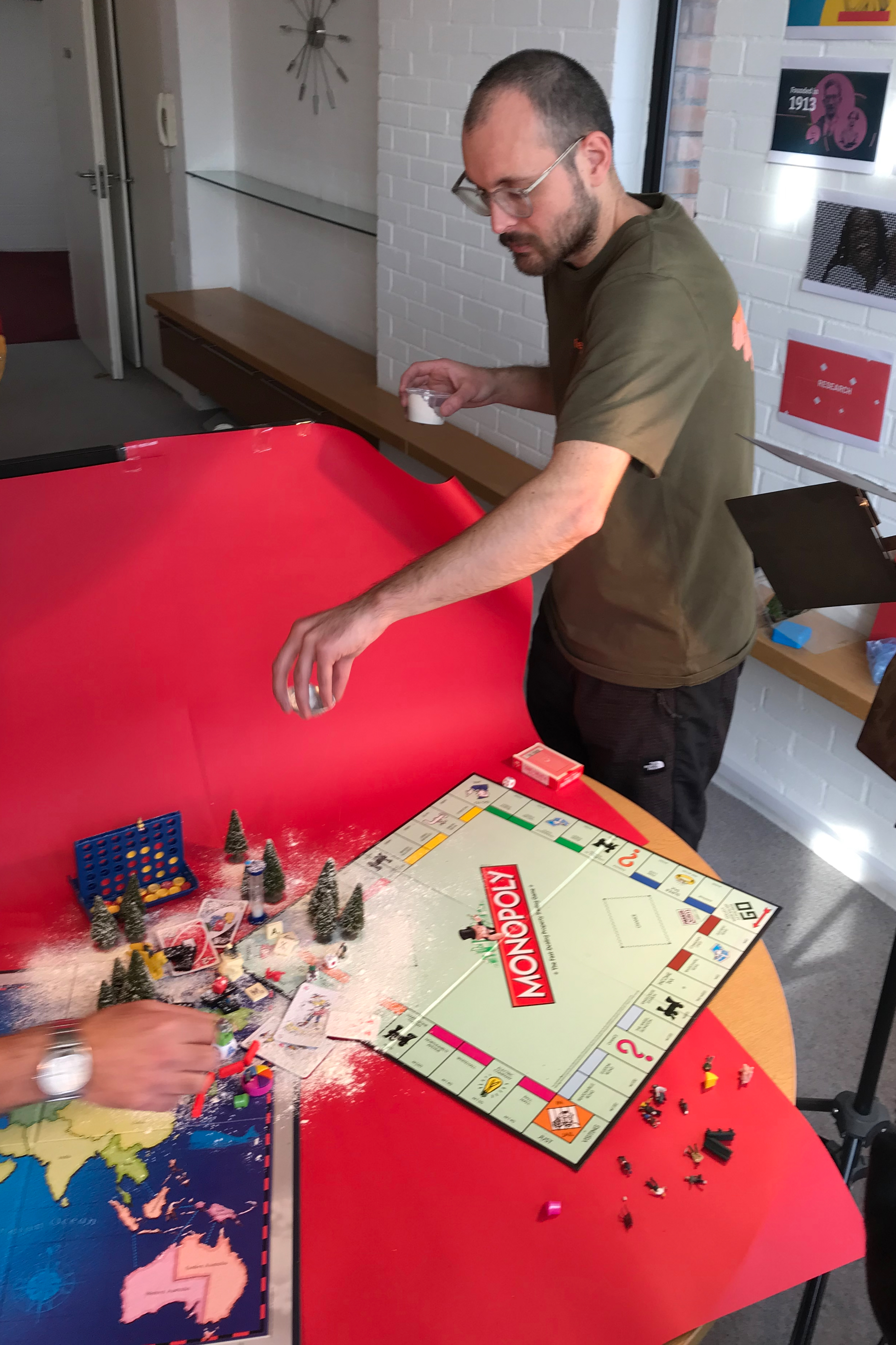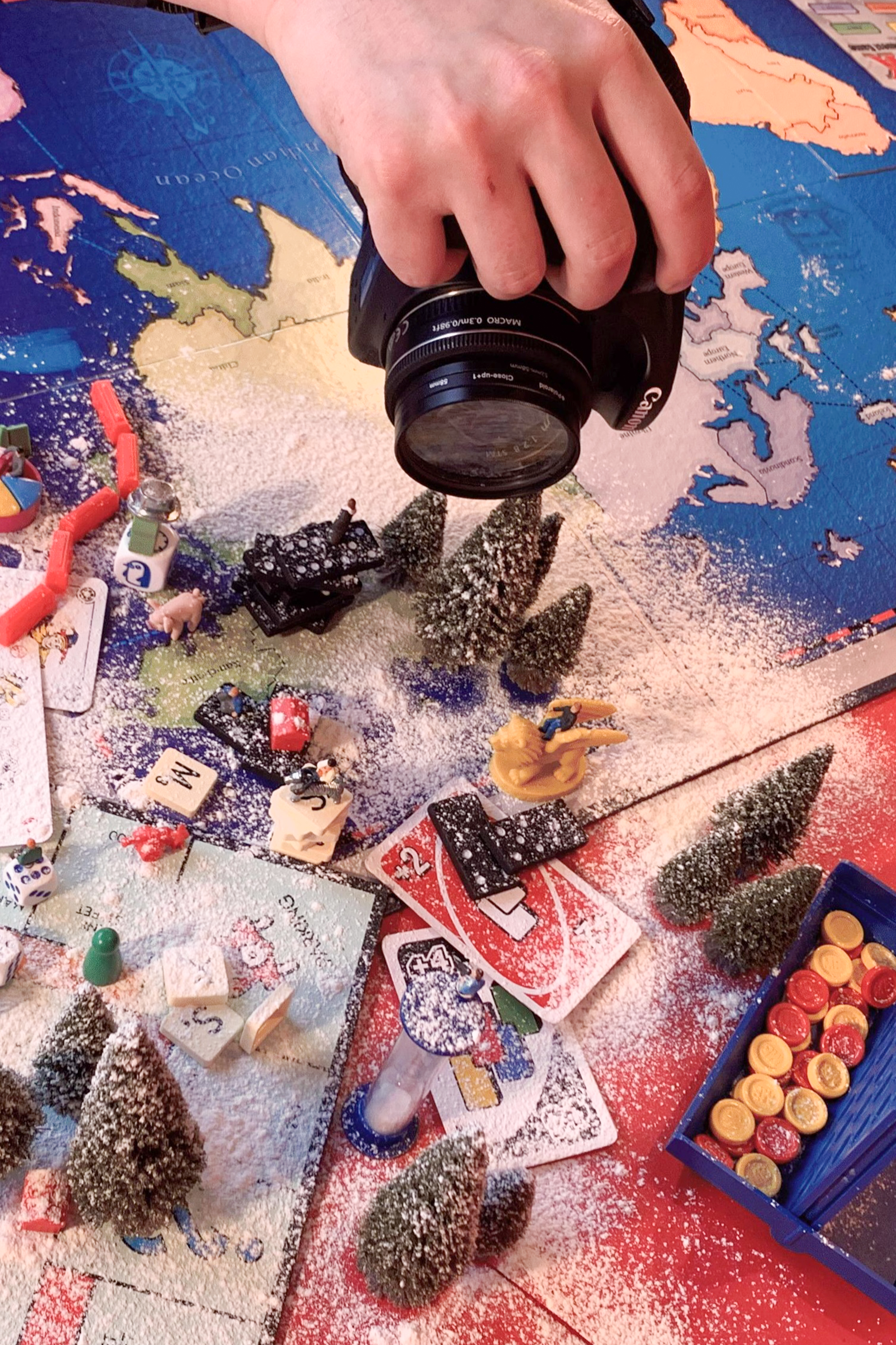 Following on from last year’s e-card, we used our miniature figures and inspiration from our board game night out to create a snowy scene for our Christmas card celebrating our love of board games. The eagle eyed will no doubt spot the little train carts from Ticket to Ride with the much coveted Monopoly money; the vibrant Trivial Pursuit triangles (or are they cheese wedges?) and bent Uno cards sit amongst the cute mouse meeple from Root and the lion treasure from Forbidden Island. Games, both traditional and contemporary, are celebrated in our wonderland scene topped with snow (or flour)!