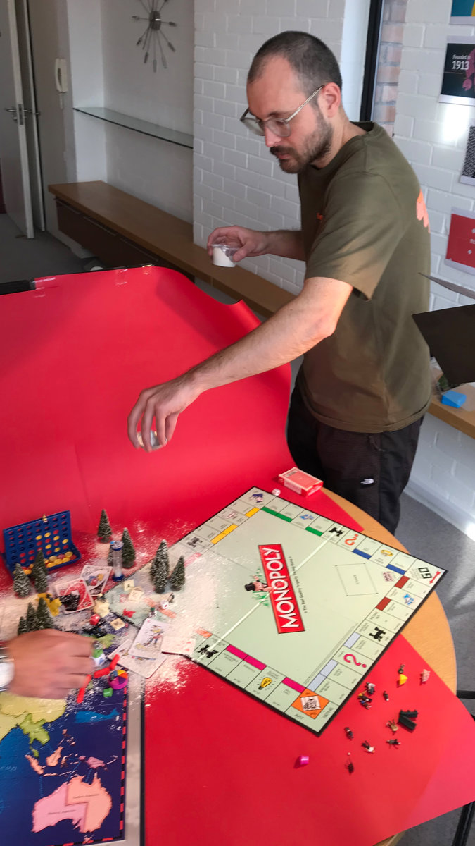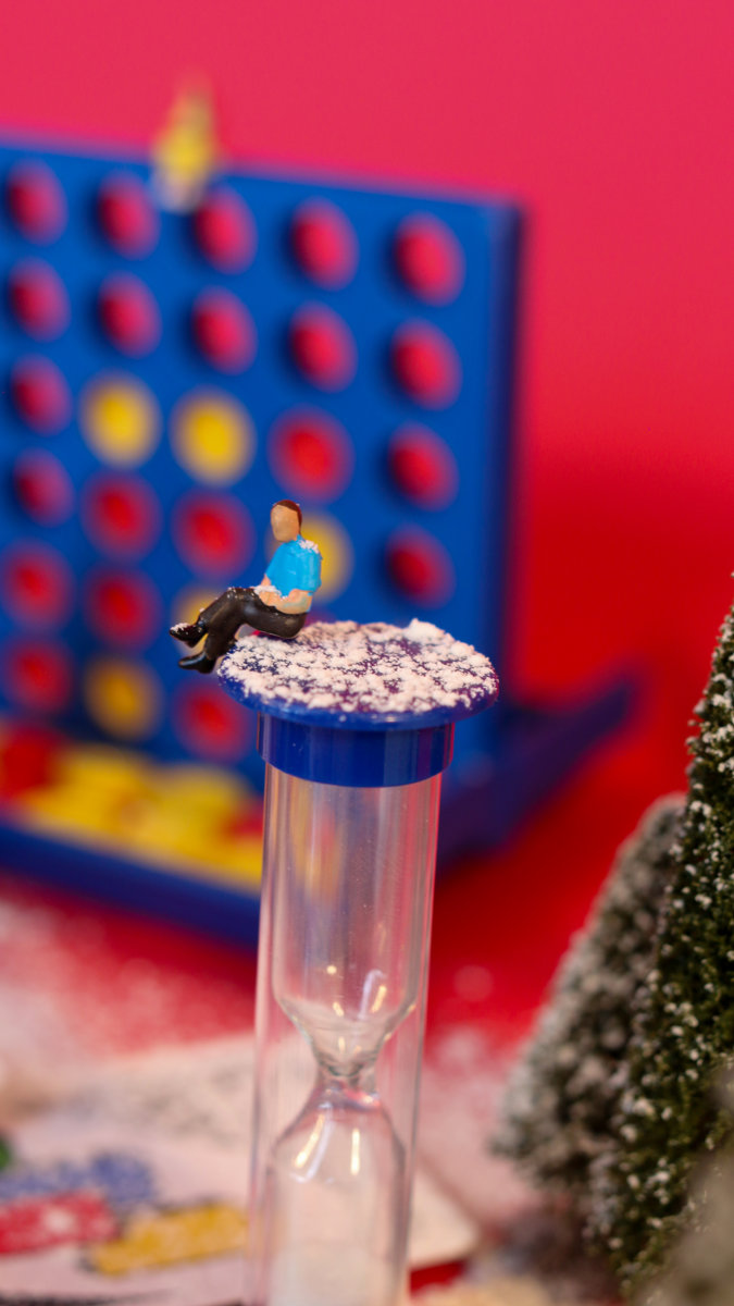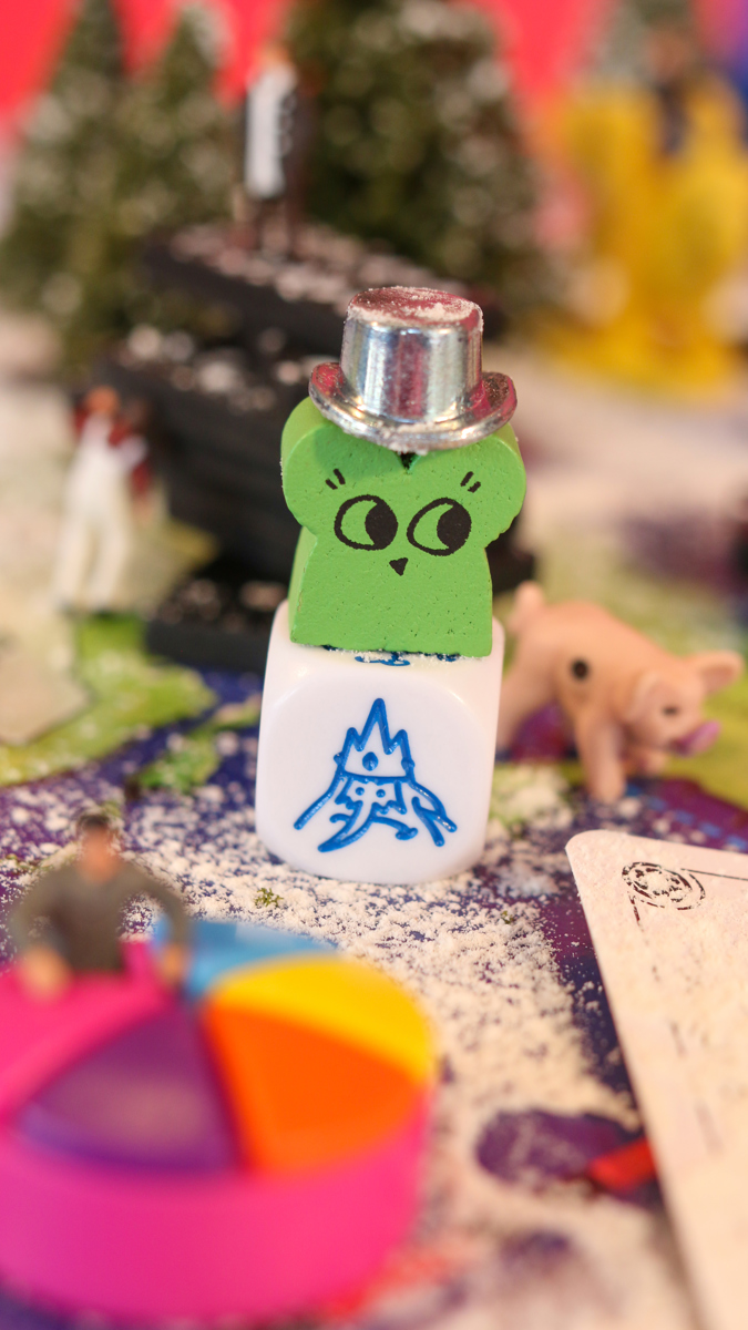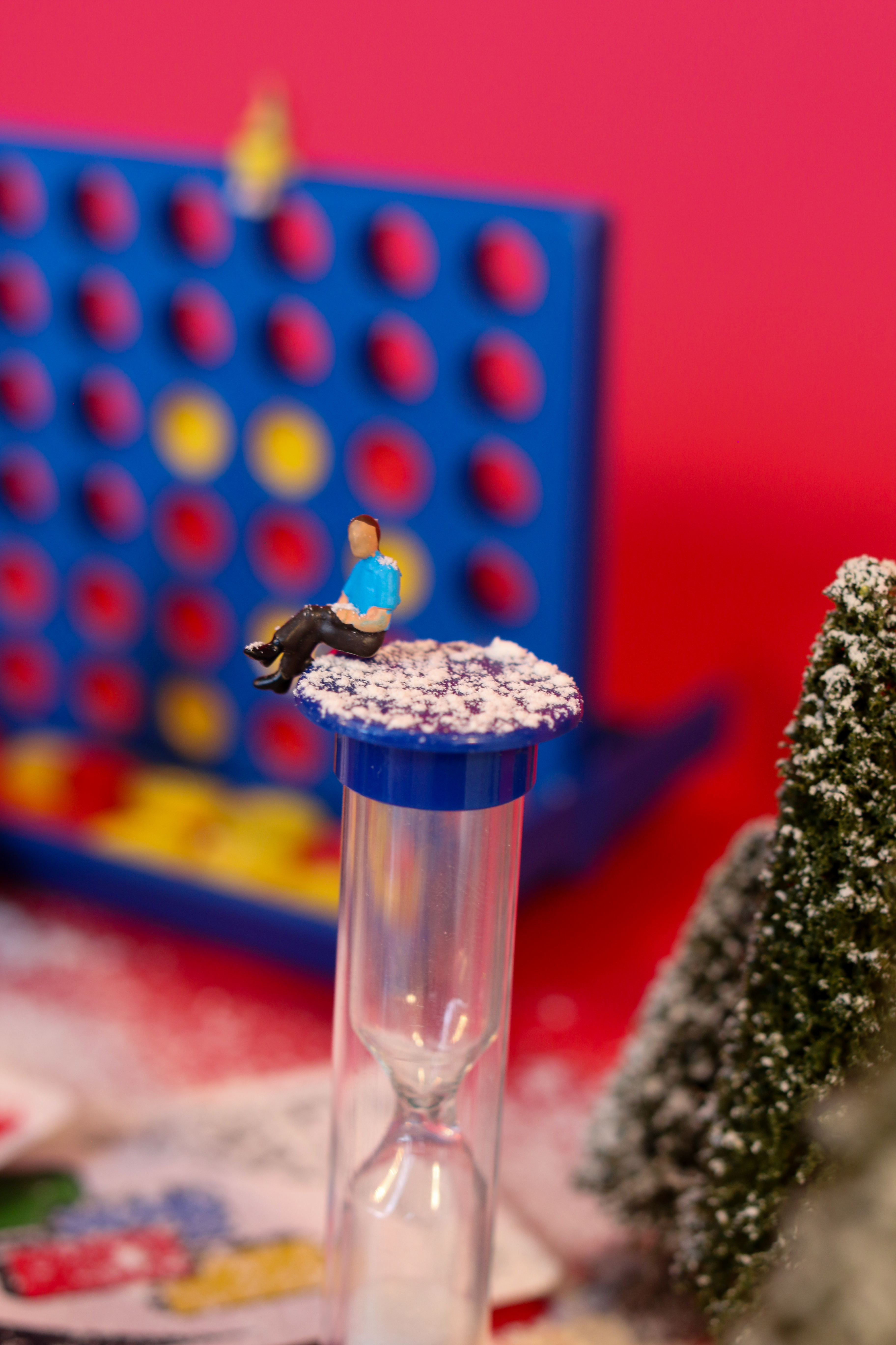 Following on from last year’s e-card, we used our miniature figures and inspiration from our board game night out to create a snowy scene for our Christmas card celebrating our love of board games. The eagle eyed will no doubt spot the little train carts from Ticket to Ride with the much coveted Monopoly money; the vibrant Trivial Pursuit triangles (or are they cheese wedges?) and bent Uno cards sit amongst the cute mouse meeple from Root and the lion treasure from Forbidden Island. Games, both traditional and contemporary, are celebrated in our wonderland scene topped with snow (or flour)!