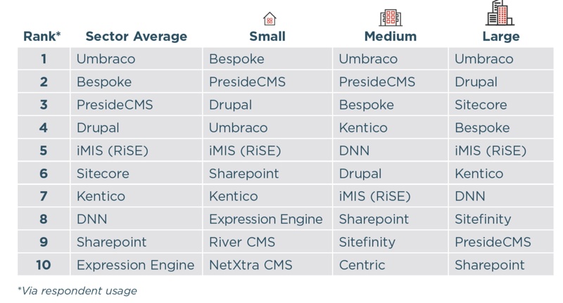 - Umbraco stands out as the leading CMS utilised by medium to large membership organisations.