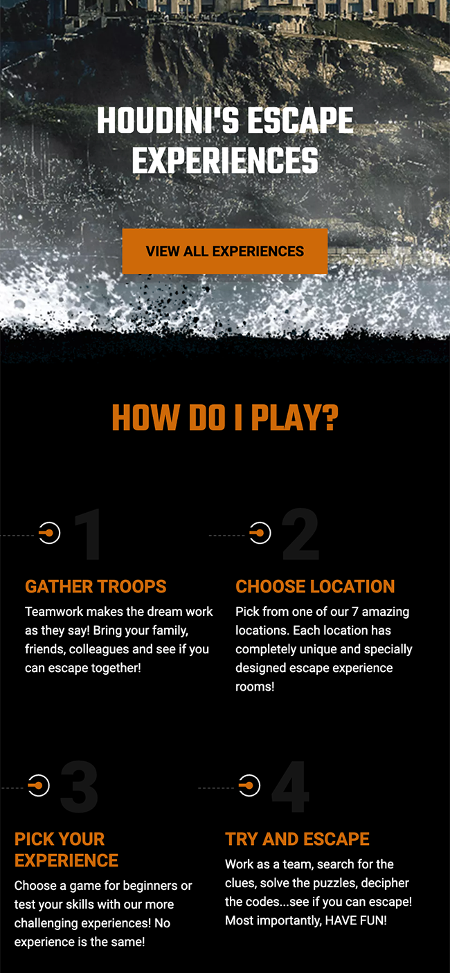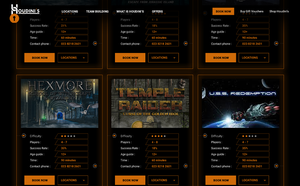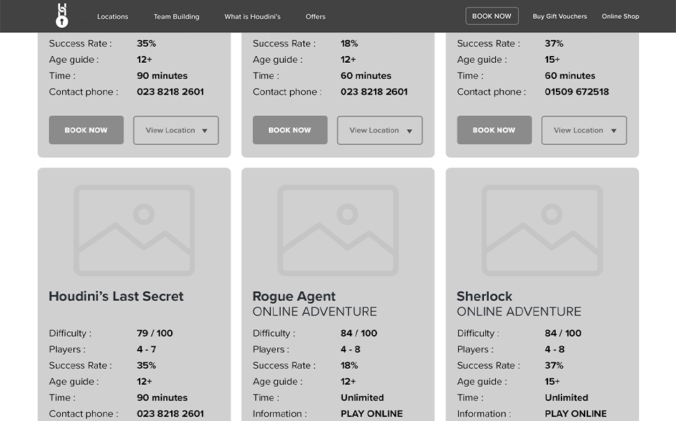 As a result of this analysis, the collective effort of our UX and creative team has resulted in a stylish, impactful, and easy to navigate website for Houdini's, designed to maximise sales and conversions. The product built ensures users can easily move between locations on the website, and its accessible design provides clear details on the experiences offered in each location and how they differ.