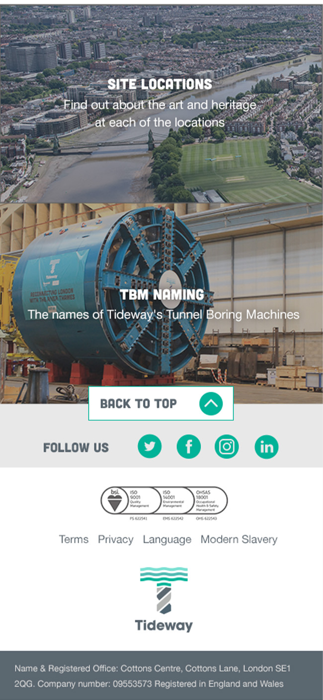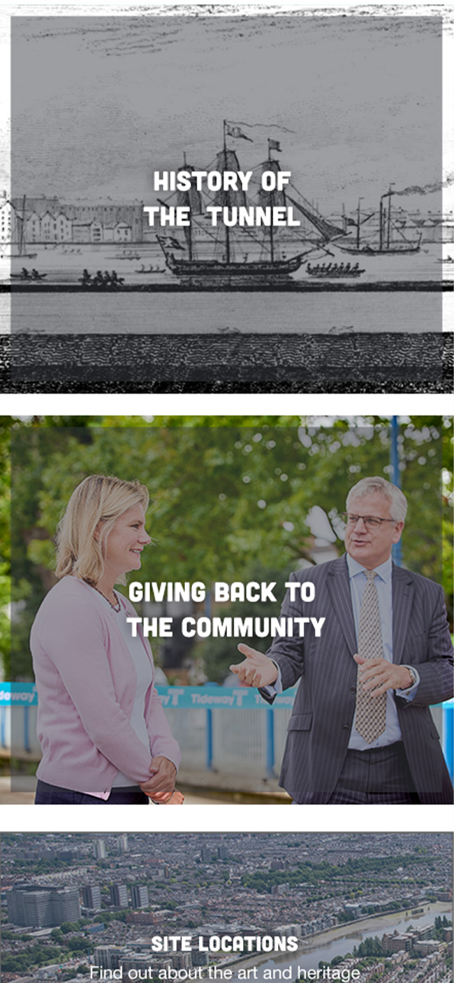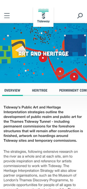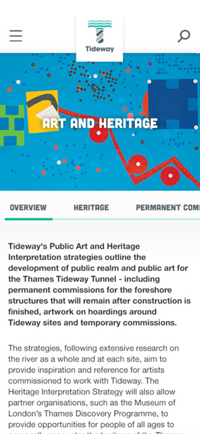 Mentor Digital built upon Tideway's existing branding and using a mixture of visuals such as time-lapse, and interview videos throughout the site. This 'people-focused' approach complemented the advertising of Tideway's art campaign 'Art on the Tideway', a public art movement, which invites contemporary artists to interact with the tunnel through a variety of commissions, tying together culture, heritage and the landscape.