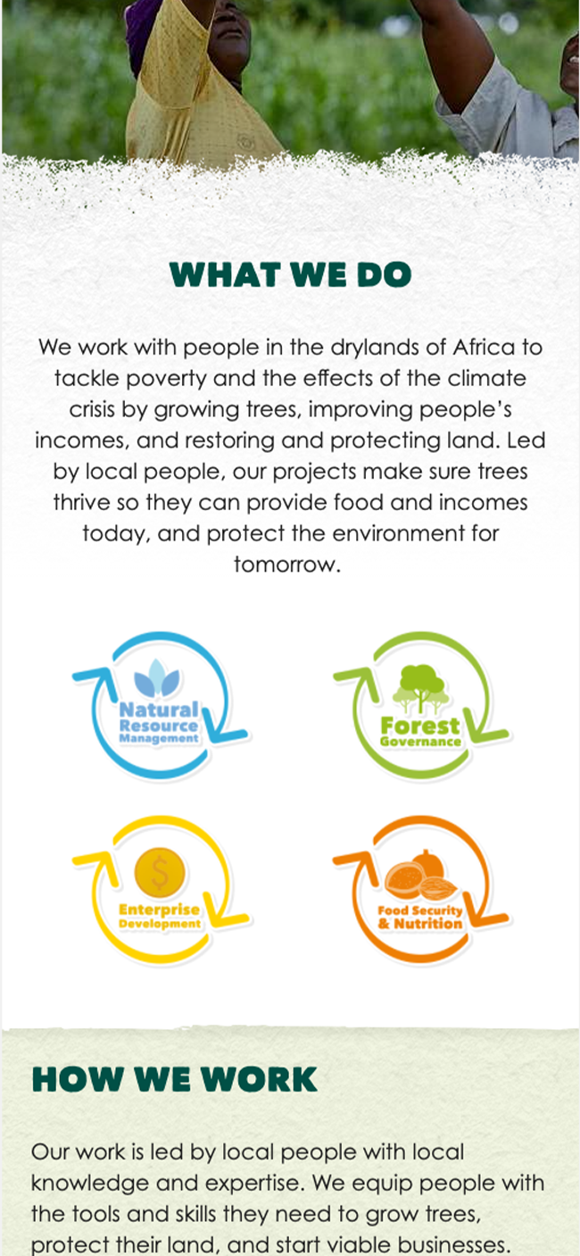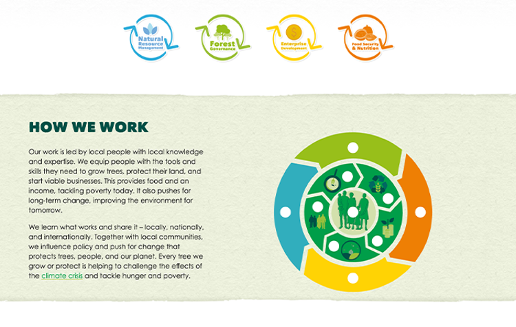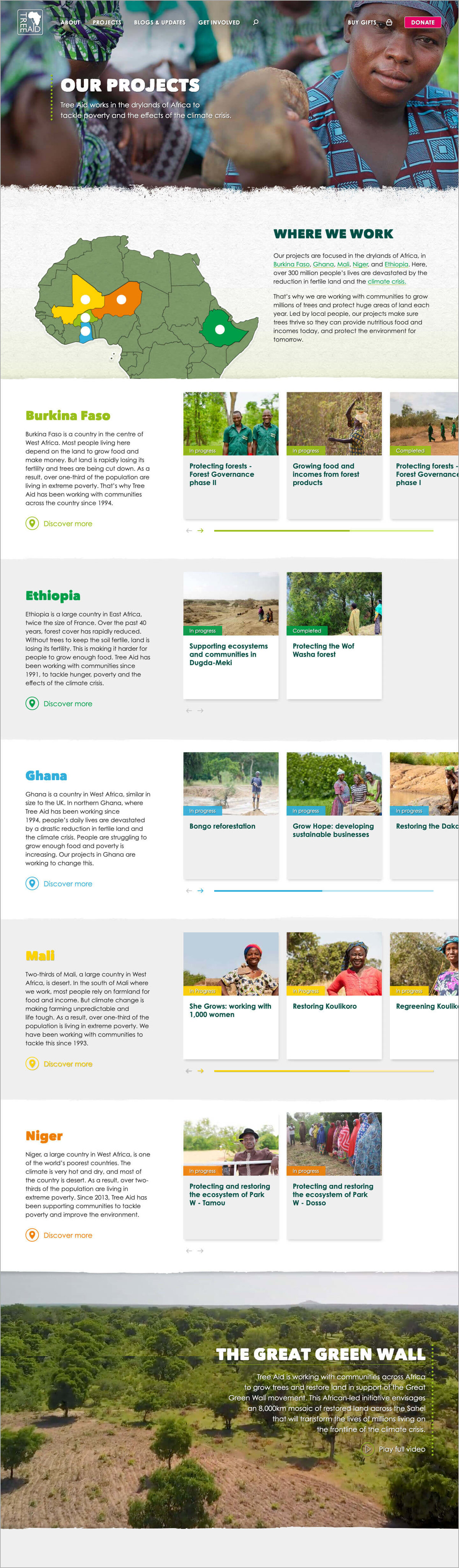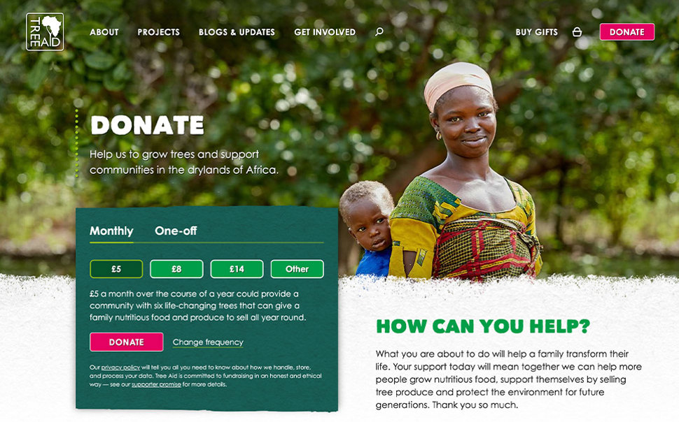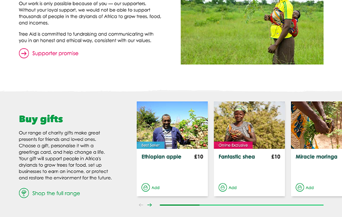 This fantastic project helps sustain the livelihoods of local people living in some of the world's harshest environments. This excellent work is reliant on the generous donations and gifts managed through Tree Aid's website, which was in need of considerable improvements to the design and navigability. As part of the new build, we delivered;